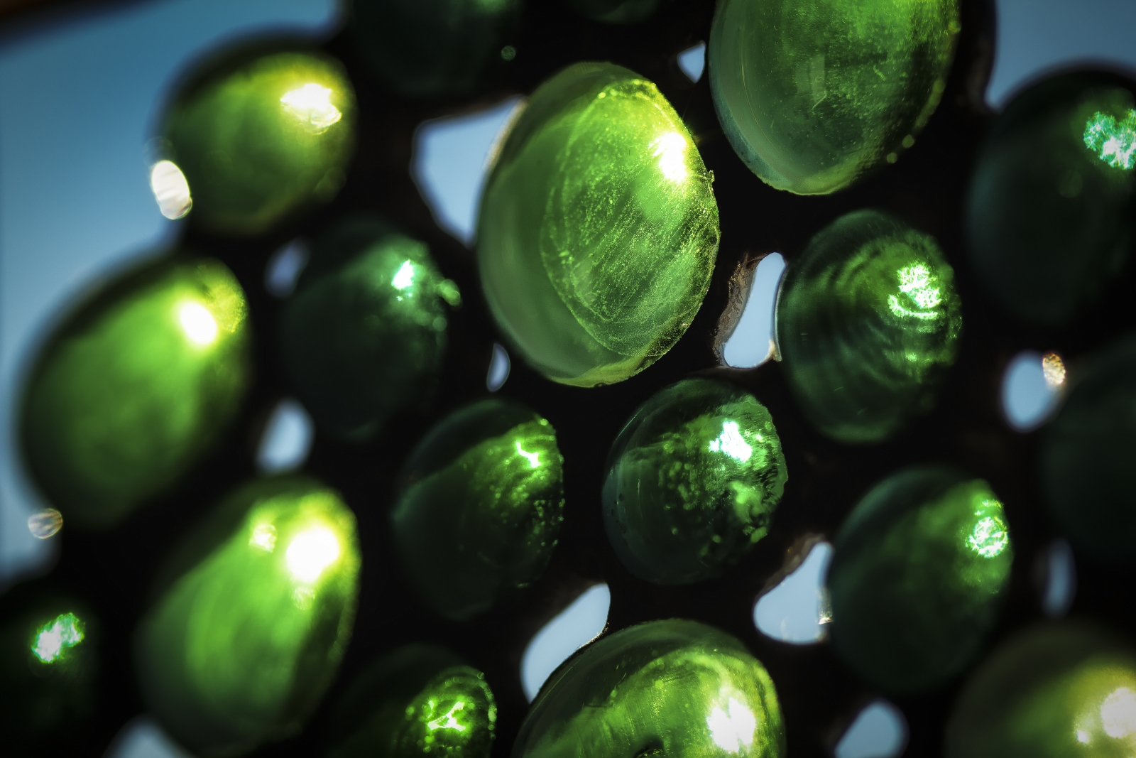 Winter’s sun gleams passing through translucent glass, stained glass hung in our kitchen window to catch sunlight from the southern exposure of our home. The image, a macro shot, plays with depth of field – focus and blur – and colour and reveals some of the glass interior.
