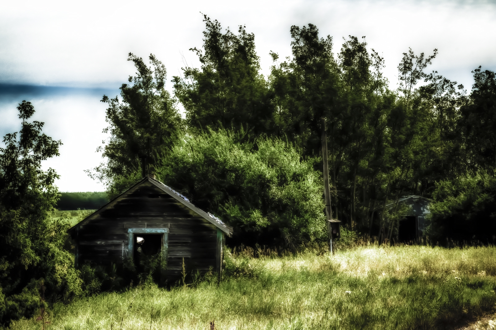 Another Shed – Along the road home, travelling north, homeward from Edmonton, I looked in on these two sheds just beyond Valleyview on the last bit of farmland crammed atop the Smoky River valley that cuts into the land, the road descending to the Smoky River and the bridge crossing it. Retro-teal, a bright energizing colour from Canada’s fifties and sixties draws the eye to the shed door’s post and lintel, reminding of another post and lintel painted in lamb’s blood as protection from an Egyptian death all those years ago. This shed, now in dis-use, has once been a structure thought-of and to be built, then a building allowing a farmer to store and shelter equipment and supplies, and, it’s been a place people have worked in, a place allowing possibility.