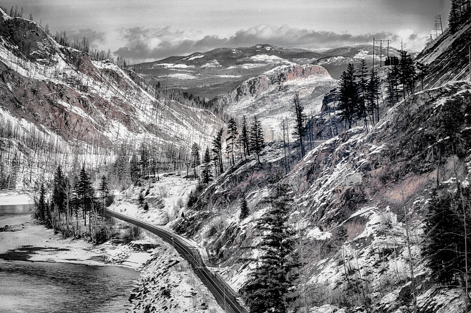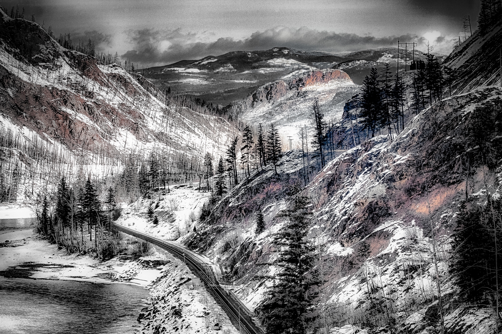 This high dynamic range image is a final outlook over the valley that leads north and east into McLure, British Columbia. Depth within the image is created overlapping elements within the composition, the mountain forming the background is overlapped by the central mountain, then the mountain on the left (middle ground) and finally the mountain on the right (closest – foreground). The train track leads the eye into the photo and you explore your way from foreground to background. Colouration versus black and white in the images also helps accentuate depth.