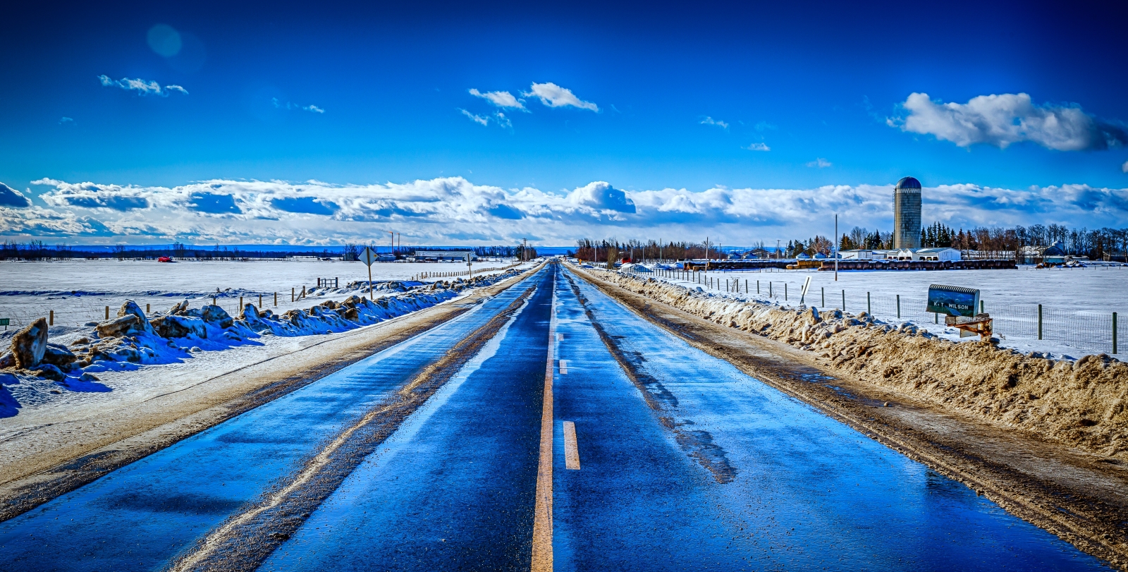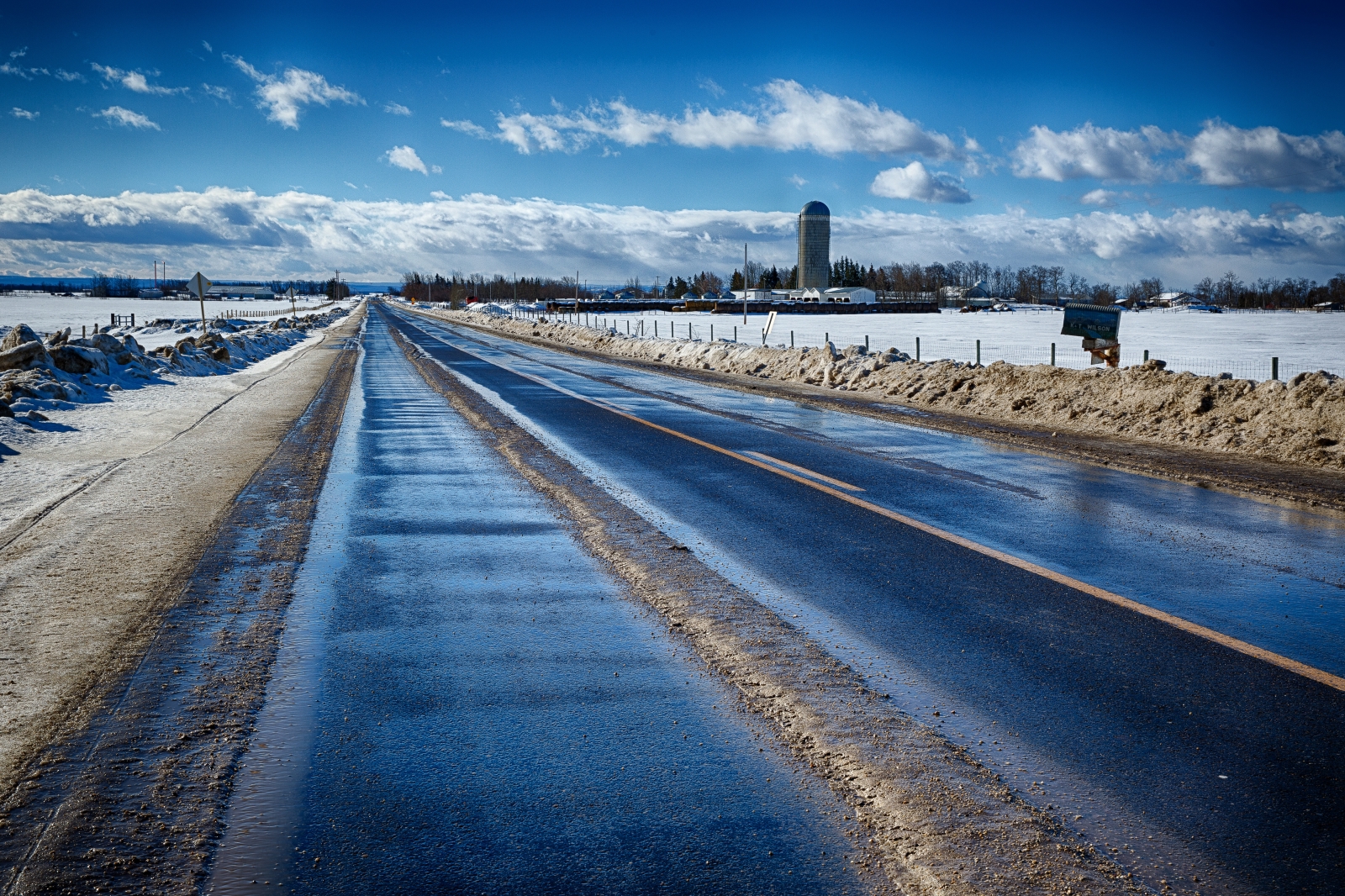 Sunday, on the other hand, swept in with substantial spring muster. To the west from Grande Prairie clouds billowed as they crossed the final strip of the Canadian Rockies before meeting foothills and prairie. The photos presented here are ones gathered along a westward trek from Grande Prairie towards the Rockies – an interesting area in terms of landscape and it being a bright spring day. The subject is a paved farm road near Beaverlodge, Alberta – something extraordinary for me as most farm roads I have known have been gravelled ones. Here, the reflection of the sky colours the road blue.