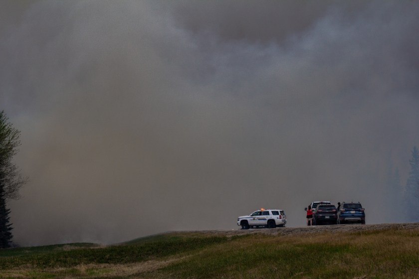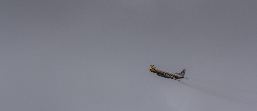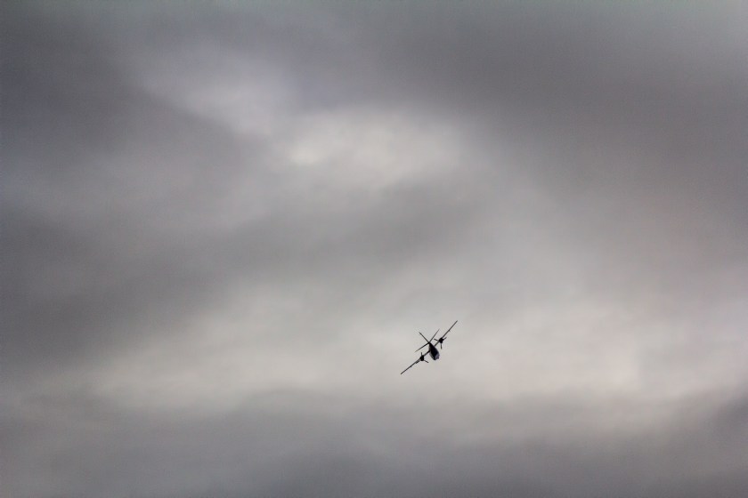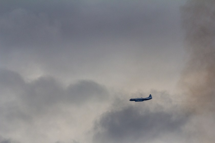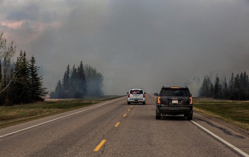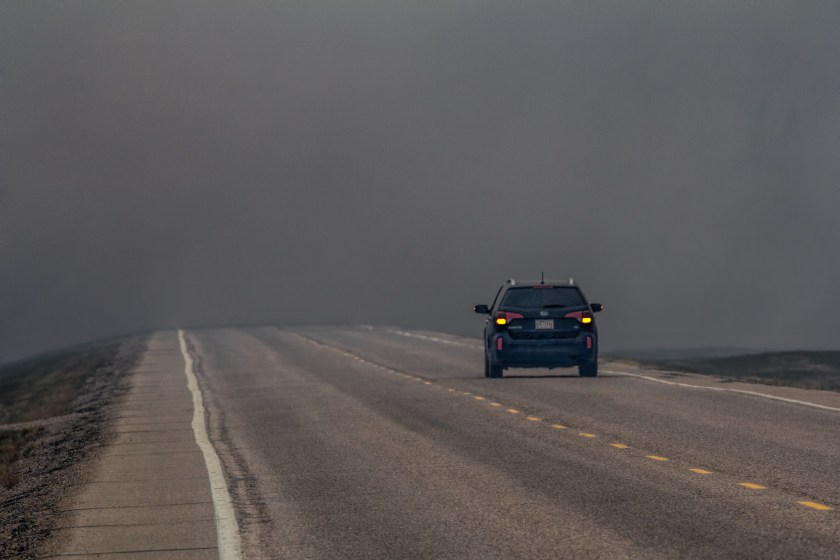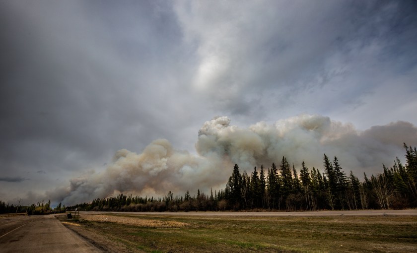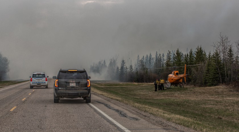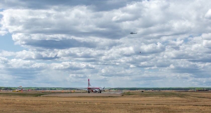 In our neck of the woods, most people within the Mackenzie County (Alberta’s most northeast region) were impacted by a wildfire that began in May and still smoulders now, in December, despite snow and cold. We were evacuated from High Level as were surrounding communities as wildfire threatened them. These images are from a drive home from Edmonton to High Level. The Thursday before I had witnessed a truck on fire near Valleyview – thankfully the drive was alright and fire consumed only the tractor; it had been carrying dangerous, volatile goods. Here, though, the Chuckegg Creek fire was within its first twelve hours of burn. At the point these images were taken, the fire was 28 kilometres from High Level. Within a week the fire had made its way to within five kilometres of our town. We evacuated. Here, in this May image, RCMP were dispatched to limit drivers driving the highway within fire and with visibility limited by smoke. A helattack crew flew to the area to work with Wajax bottles and to assess the fire. Later an air tanker came to the seen to lay down fire retardant. At August’s end, the fire was more than 350000 hectares large (CTV News, 29 August 2019).