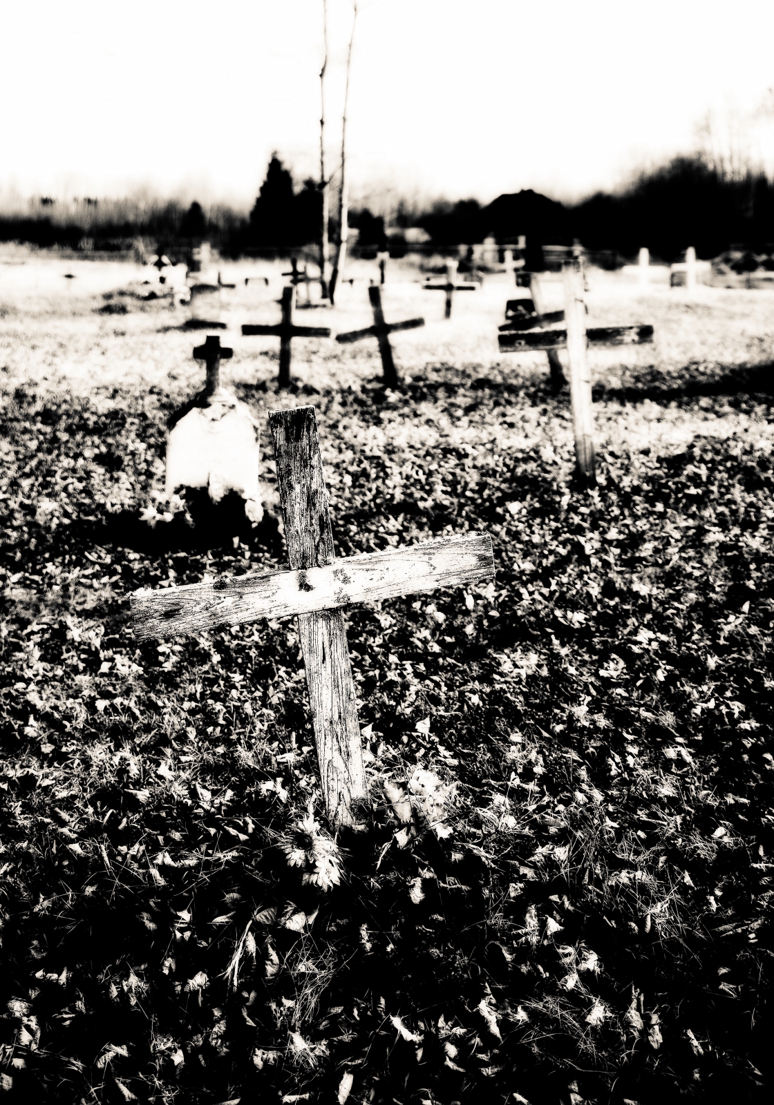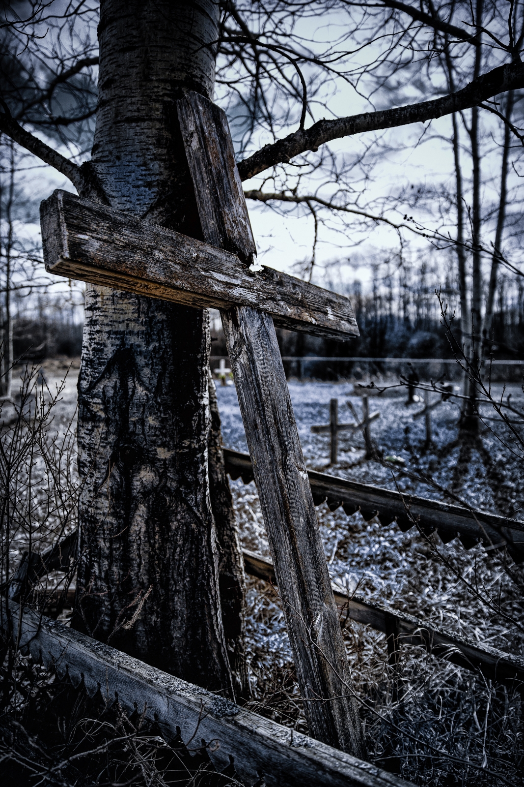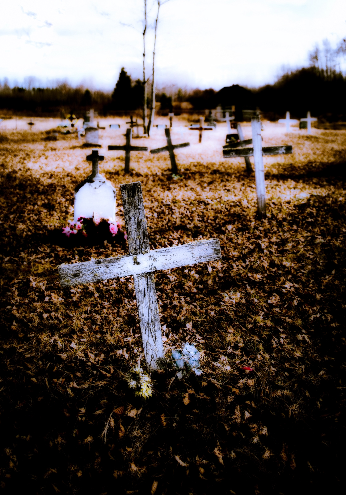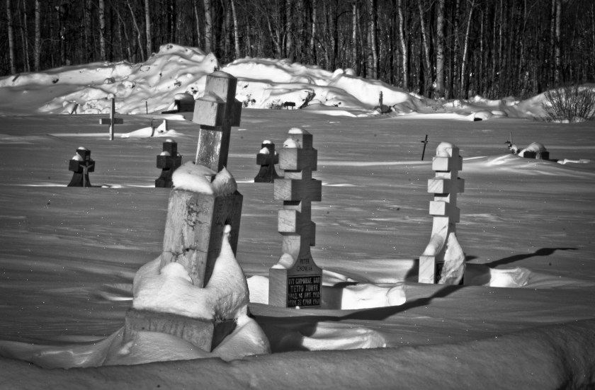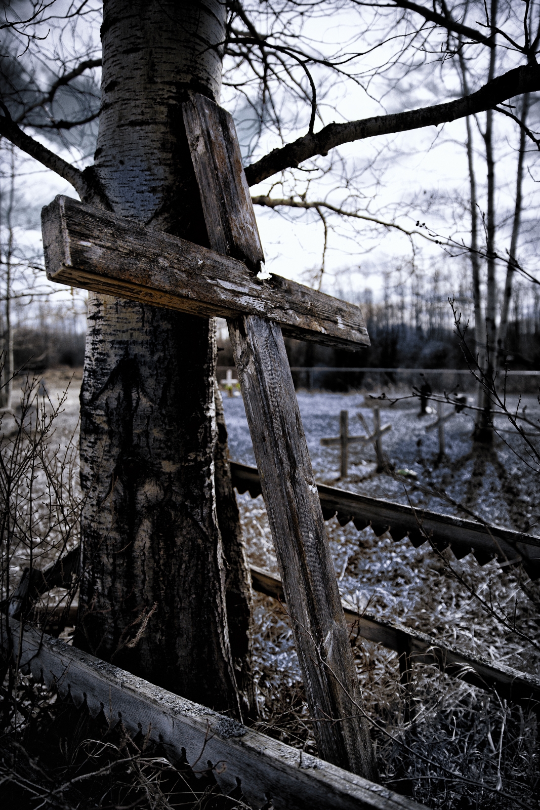 Crosses and headstones dating back to the middle eighteen hundreds cluster, serving as grave markers in the St. Louis Roman Catholic Mission cemetery in Fort Vermilion’s North Settlement (the north side of the Peace River, a settlement that has become known as Butter town). In the center of the cemetery a full-length cross leans against a tree. Not only does this cross provide visual reminder and echo of Christ’s words, “If anyone would come after me, he must deny himself and take up his cross daily and follow me (Luke 9:23-24),” but it serves as reminder that at Life’s end the cross will be put down and put away.
