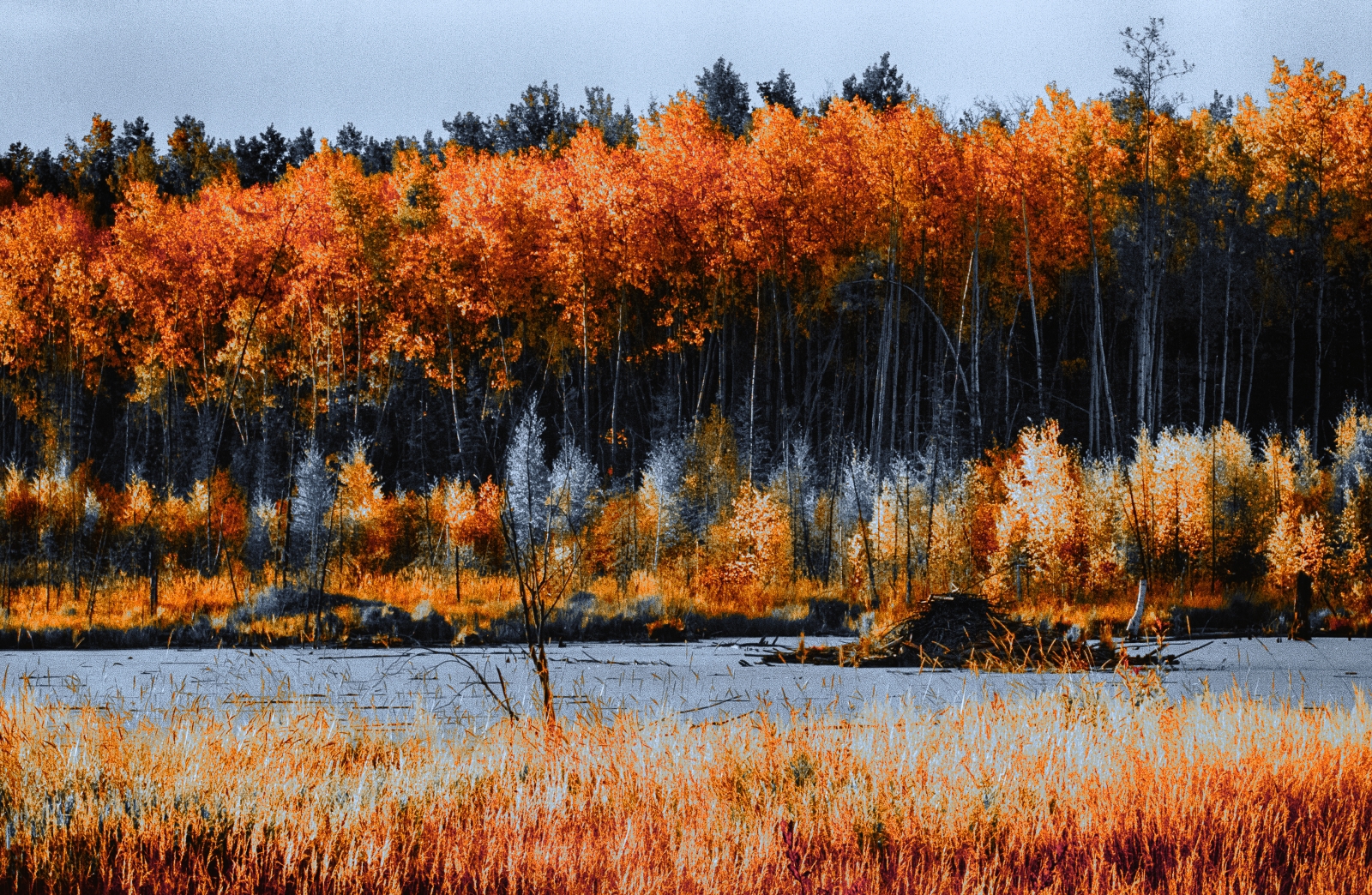 Harvest, though, caught me by surprise. Somewhere between 10:30 – 11:00 p.m. I drove past this late-night harvest scene below. The sight was extraordinary for me because the grain harvest in northern Alberta occurs from late August to mid-September. Here, it was an extraordinary sight … to see as many as five combines gathering grain from the prairie immensity. These mid-August images contain silhouettes of combines and grain haulers outlined in black against a colourful backdrop of setting sun, sky and prairie. People are at work, doing this day’s work as daylight diminishes.