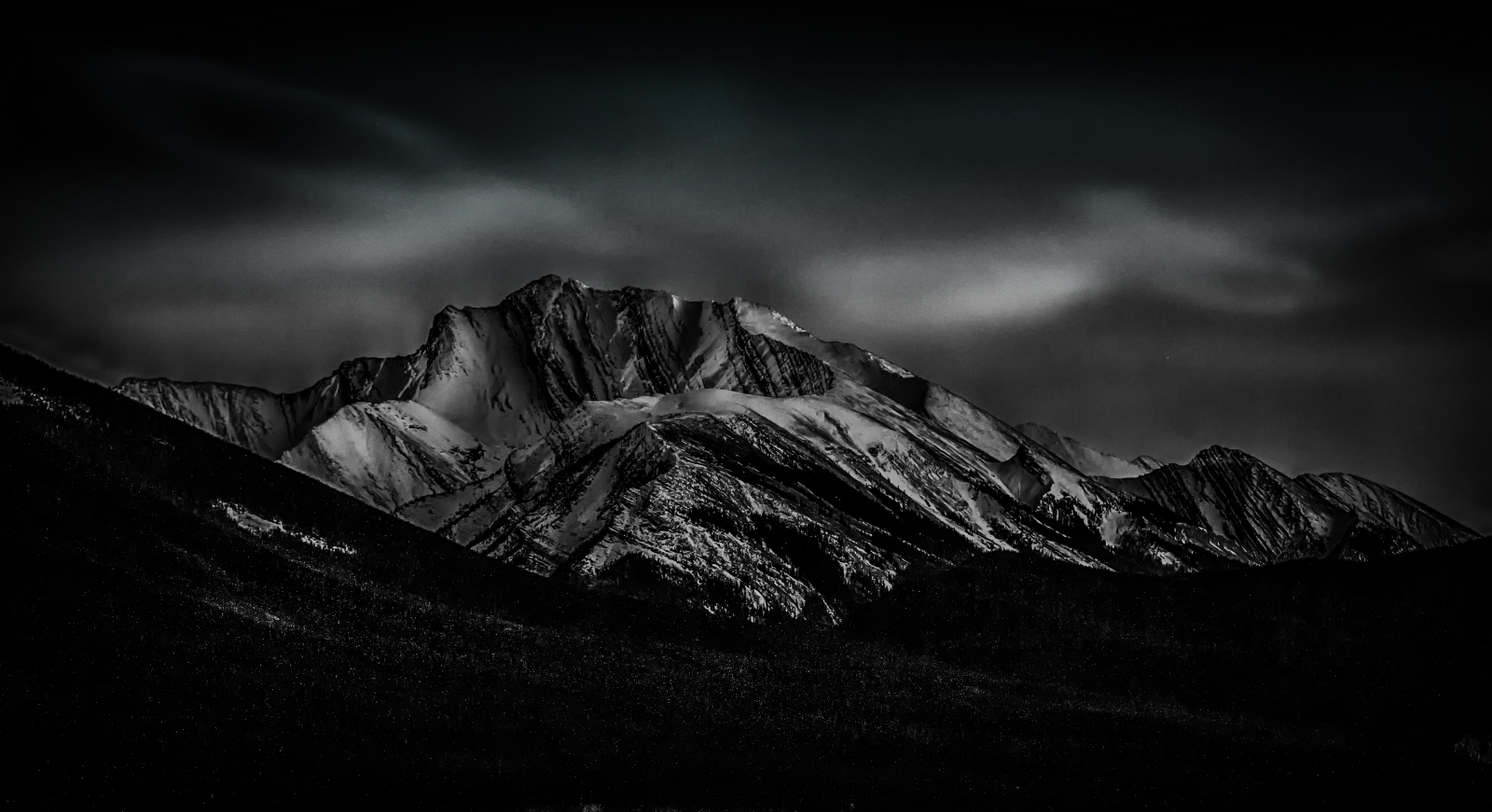 In a drive to Kananaskis two weeks ago, there were many points of ‘recognizing a shot,’ those shots that could be taken, those points of becoming mentally aware of photographs that were available – frost covered, harvested farm fields at sunrise south from Peace River as shadows stretched across land, something not usually accessed by me in my usual travel times; bright yellows of hay bales and patterned swaths on farm fields west of Calgary; cattle ranches along rolling foothills in autumn colour moving into the Rocky mountains; shadows cutting into forested Kananaskis mountains along snowy ski trails high above in the last hour before sunset. These images were available in that drive – the choice really became about whether or not to pursue photography along the way versus waiting for the photography that could occur at destination. The images that follow are Kananaskis images, photography at destination – the three final ones are shot at night during full moon.