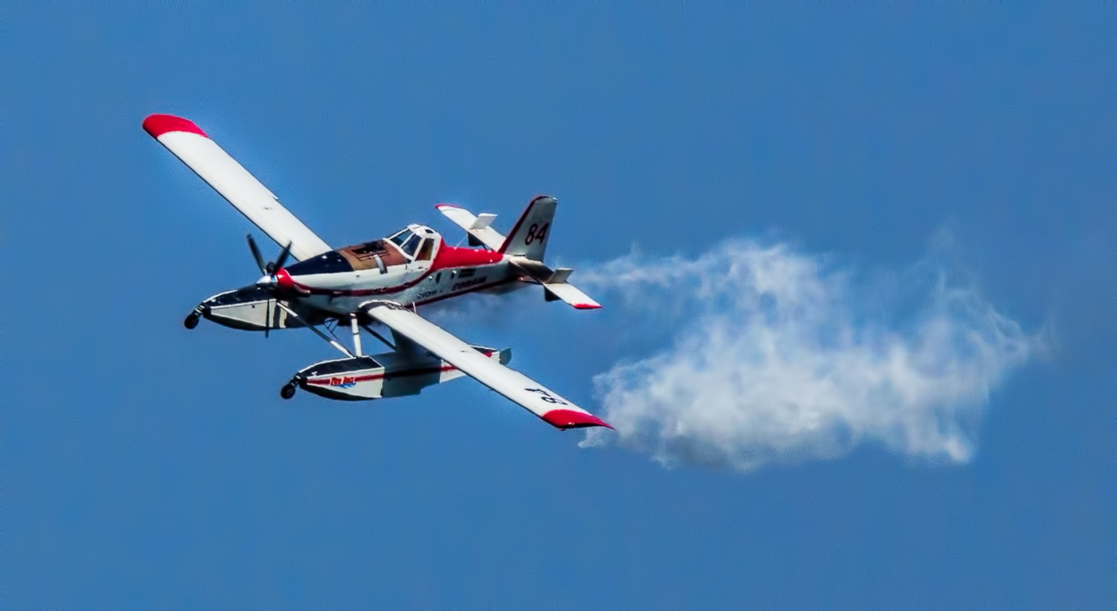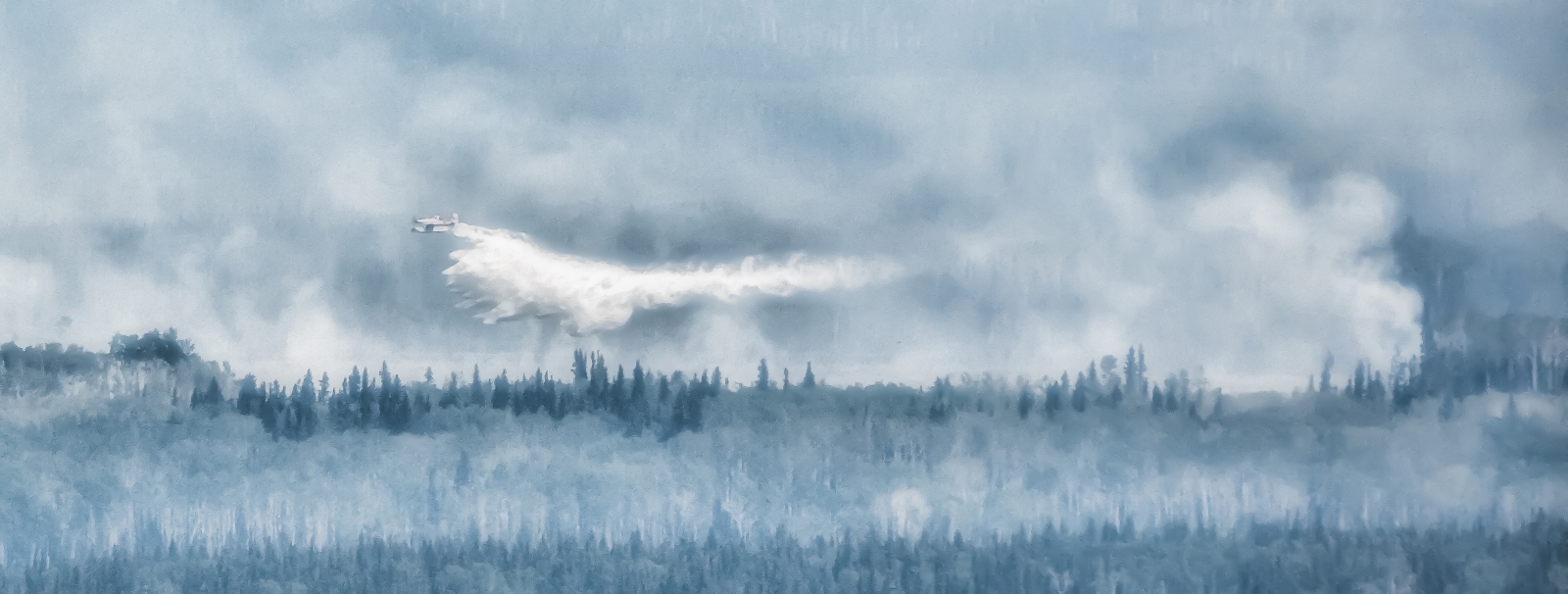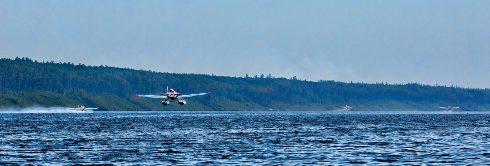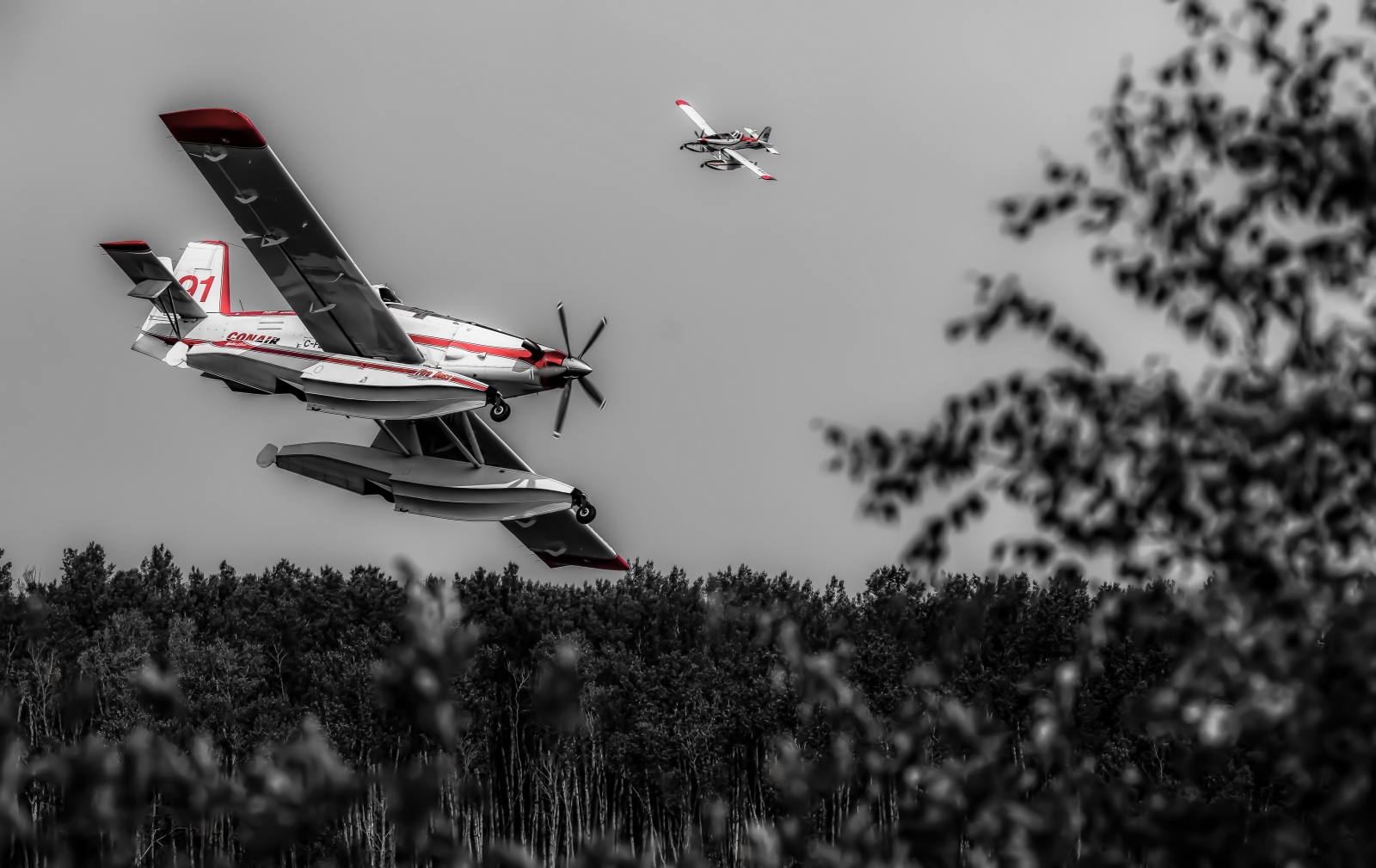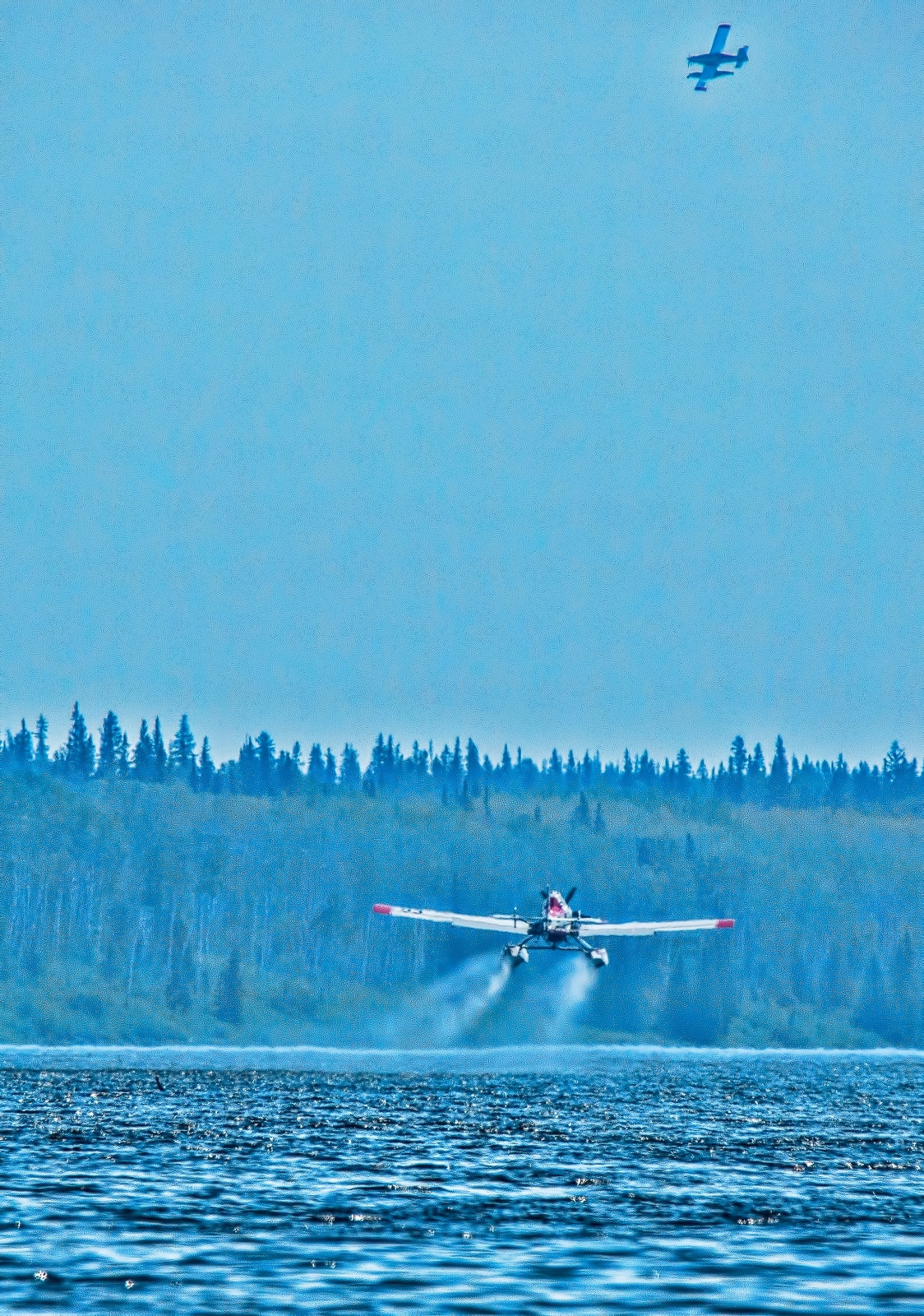 Yesterday, I drove out to Hutch Lake, 20 kilometres north from High Level and saw that forest on the east side of the highway was smouldering; air tankers and helicopters slinging water were dropping water on the fire. I was able to photograph a team of the smaller Amphibious Airtankers as they dropped water on fires and skim across Hutch Lake loading water into pontoon tanks.