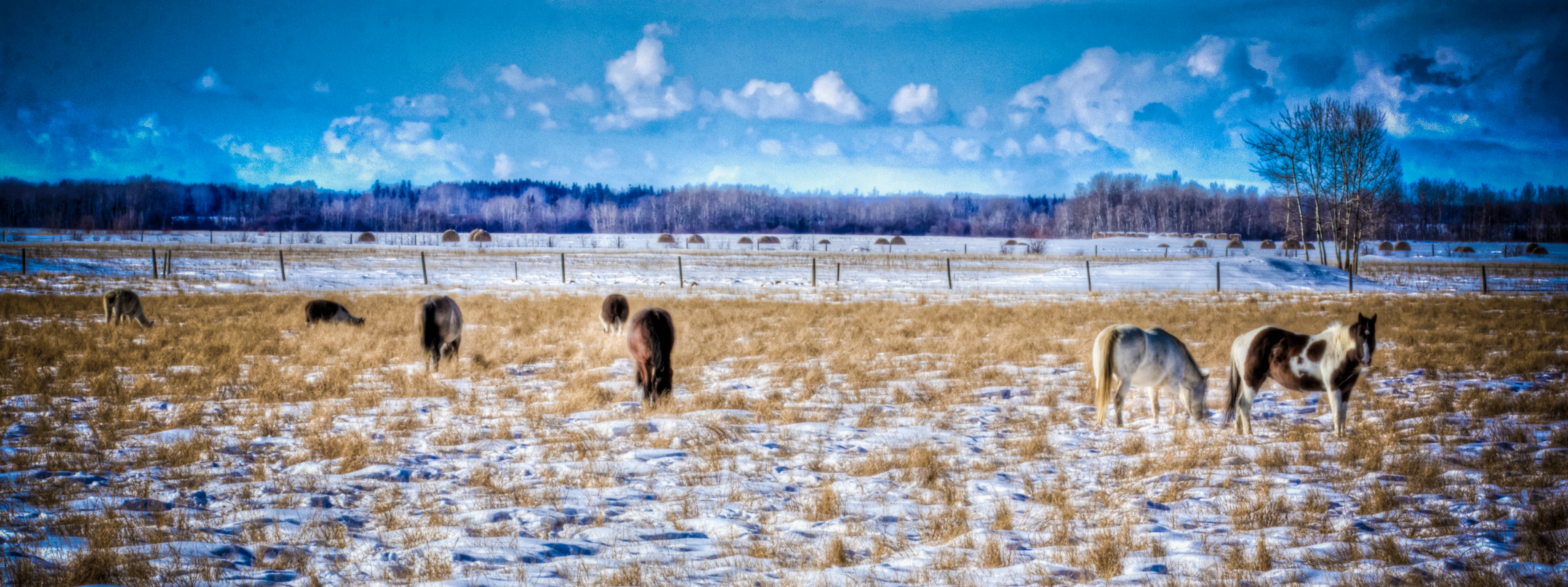 Saturday – a day to get out and about with my camera, a day not to sit still in front of my computer editing or writing, a day to use for breaking out of the box in terms of subjects photographed, a day to push my never dones … finding that which I haven’t yet photographed. Most of us in the northern hemisphere are no doubt in kindred spirit, waiting in what seems a long-suffering stance for spring’s thaw, a thaw that the Woodland Cree assert brings with it a thaw in people’s inhibitions. This period of time prior to spring’s full-on melt is notorious for people’s crumbling inhibitions and for people saying what’s really on their minds. In this season, one’s behaviour and how it’s judged tends to count for more than legitimate investigation of the inner life that produces it – it becomes easy to fall prey and victim to other’s perceptions. It’s a season when minor social injuries can occur, when a spade is often inaccurately called a spade, when you can be caught having said a wrong thing, when the day before can look just like the day you’re presented with, a time when it can be difficult to see the forward movement toward and into spring. It is a smart time, however, to focus and pursue a never done, to break out of your mould and to extend yourself into new reaches of growth, learning and practice. Saturday’s endeavor has been about finding new subjects to photograph, subjects I rarely photograph … but ought to. Here, four horses and three lamas are the subject of the photograph presented here. Three and half hours into my southward drive toward Fairview, Alberta I encountered the animals on the west side of the road in the last ten kilometres traveling into Fairview. The day was warm with wind and temperatures hovering around freezing. Snow was melting, light was bright and intense and the day’s heating of the world caused dramatic interplay among the clouds being created, shaped and blown around – a windy, tempestuous start to our March, 2012.