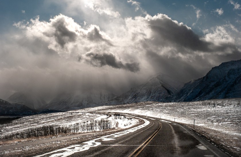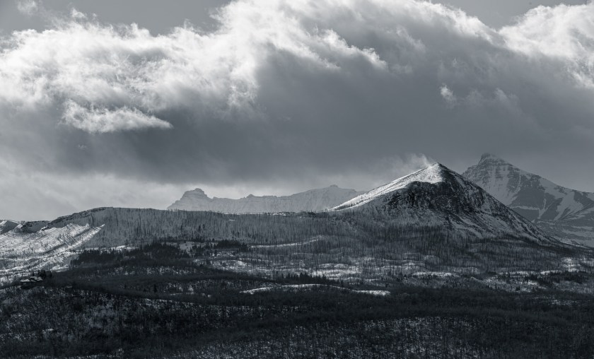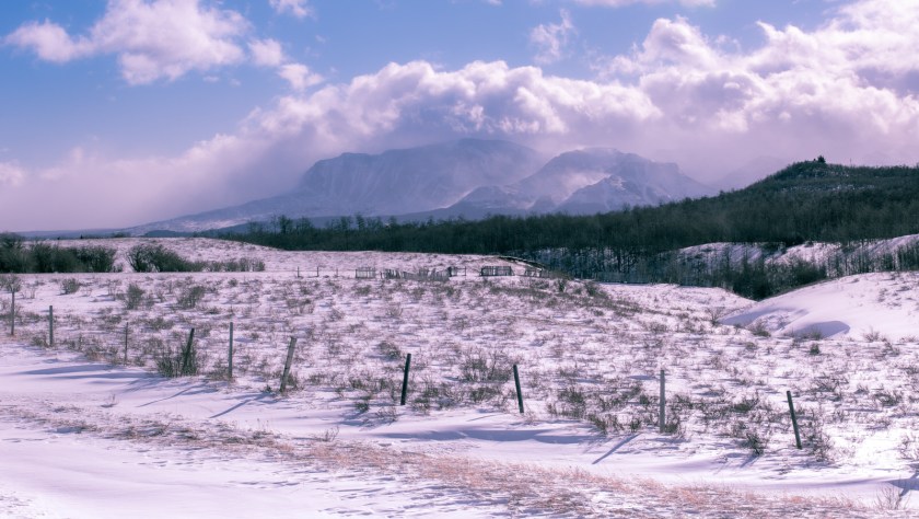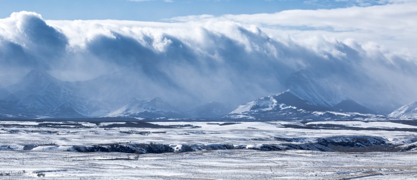 The next day, after a good breakfast at the hotel, I started out. The day began as one overcast with heavy, grey cloud. But, weather in this part of Alberta is quite changeable in terms of how it interacts with the Rocky Mountains. Mountain weather is something intriguing, especially for my northern Alberta eyes – something I remember from times hiking along mountain trails on out-trips in the Crowsnest Pass and when camping in Banff and Jasper. Almost as soon as I moved south and west from Lethbridge I encountered windfarms – rows and rows of gigantic, white wind turbines used to gather / produce electricity. I would drive south from Fort MacLeod and on my route to Pincher Creek I would find other wind farms. In posting wind farm images on Facebook, earlier this year, I would find that many people in southern Alberta no longer see their value, are concerned about their impact on the environment and find themselves rejecting how they have altered the landscape they live within. Along the drive I would find last areas of prairie within foothills. I would find homesteads as the only structures seen on the land for miles and miles, the land being that allocated for grain farming. From Pincher Creek to Waterton Lake National Park I moved further into the undulation of foothills and the mountains; the weather was mountain weather, weather that can shift rapidly. Sunshine and bright blue sky would be there one minute, the next I was driving through or standing in a cloud. Cloud work so close to land has immensity and is something to take in. Light and shadow are always moving with these clouds revealing a shifting contour, shape and relief. The highway south from Pincher Creek becomes the path along which foothills meet the front range of the Rocky Mountains. Homesteads are a part of this landscape as well – grain farms and cattle ranches. Again, changeable mountain weather, mountain and foothill landscape, farms and roads – all would catch my eye, my curiosity, my imagination.