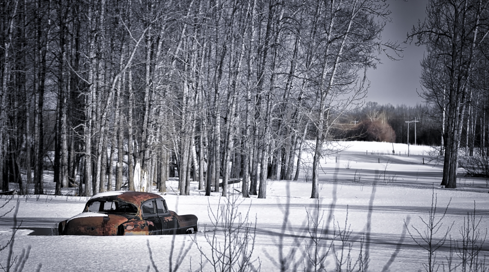 In my first years as a teacher, an elder’s coaching presented the predicament of moving through or around brush as analogy for the challenge of dealing with Life’s obstacles. If moving through brush resulted in injury, the better judgment call was that of moving around the obstacle. The key was seeing the situation for what it was. The elder was promoting the path already carved out, the natural path; for him, the established easier route ought to be the path to take. Along the road home, east from Valleyview, Alberta a fifties’ four-door sedan sits, resting and rusting, its rear window absent. It’s placement in a farmer’s field positions it along a natural path that will take it forward through trees. No longer having power to move itself, though, this sedan sits along a path that could have been.